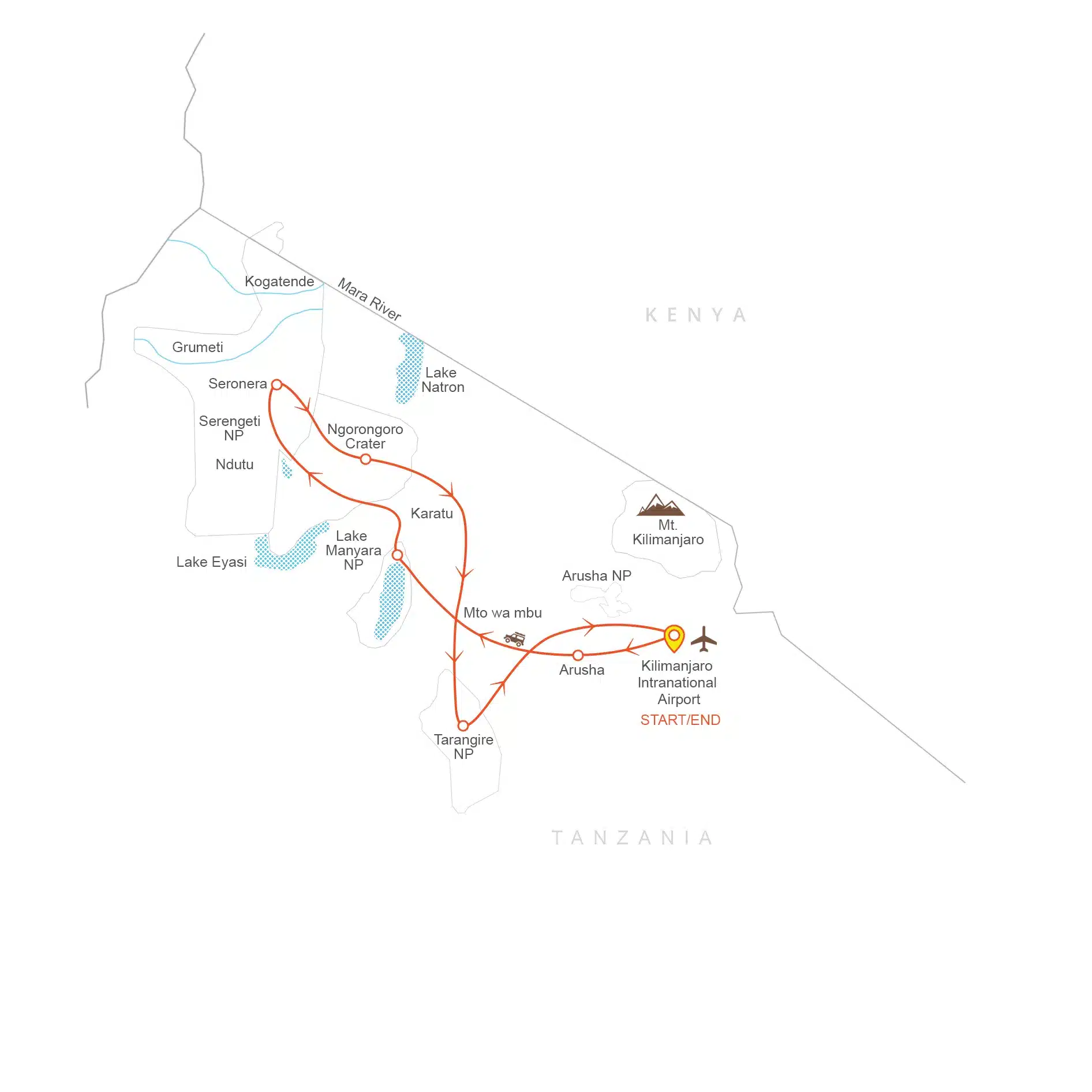 An- und Abreisetransfer: VON/ZU Kilimanjaro International oder Arusha Airport – Ein Ankunftstransfer und ein Abreisetransfer